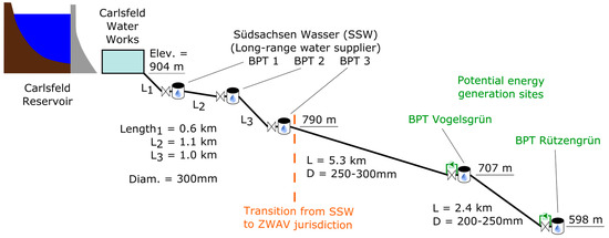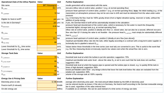 The best way to understand the methodology implemented in the tool is to follow its use step-by-step for a real-world example and show the data and results as they appear to the user. A blank version of the tool as well as a version with the data for the example site BPT Rützengrün is included in the Supplementary Materials. BPT Rützengrün of the water supply utility ZWAV Plauen is located above the city of Auerbach in the Vogtland region of Saxony and receives its water (via the higher elevation BPT Vogelsgrün) from the long-range water supplier Südsachsen Wasser out of the drinking water reservoir Carlsfeld, located about 180 m above. Figure 5 shows a diagram of this supply system. The BPT serves primarily as a pressure-reducing installation, but also has a small storage tank with a capacity of about 100 m3. Thanks to this storage, BPT Rützengrün is a class 1 site, which permits a degree of flexibility in regulating the inflow and turbine flow rate.