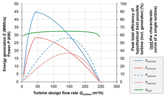 Once all necessary input data has been provided, the Visual Basic (VBA) algorithms are run to determine the optimal turbine parameters under the given boundary conditions. The algorithms iteratively progress through all possible design flow rates (see Section 2.5 through Section 2.8), computing and graphically plotting the corresponding performance parameters annual energy generation (Ehydraulic as well as Eelectrical), power (Phydraulic and Pelectrical) and total efficiency ηtotal for the chosen turbine type at the corresponding Phydraulic (for the best possible turbine, not the characteristic curve of a single turbine—see Section 2.7) (Figure 7). The optimal parameters (head and flow rate) are also displayed and added to the site curve diagram (Figure 8).