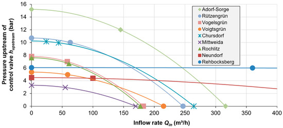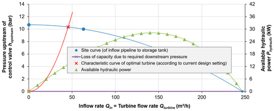 Also known as the “system” curve, this describes the relationship between the exerted pressure and flow rate in the inflow pipeline as observed from a downstream reference point within the pipeline. It can also be thought of as the pressure “available” as a function of the chosen flow rate. Typically, this reference point is taken just upstream of the pressure control valve, to capture the hydraulic conditions relevant for a potential turbine. The available pressure head is equal to the maximum pressure head (hmax, at flow rate = 0) minus the head loss up to the point of interest (hloss) and the pressure head just downstream of the control valve (hdownstream), which is necessary for the water to reach the storage tank. Since head loss increases proportionally to the square of flow rate, the curve can be well approximated (Equation (1)) with a downward-facing parabola with its vertex centered on the positive y-axis (flow rate = 0), crossing the positive x-axis at the maximum possible flow rate (pressure exerted on reference point upstream of valve = 0), at which the pressure control valve is completely open and offers no hydraulic resistance (see Figure 8 in Section 3.1 for an example). This is predicated on a simplifying assumption that assumes a constant coefficient of major pipe friction loss (defined in the U.S. as “lambda”, λ), which is known to be flow rate-dependent (e.g., as captured in Moody’s diagram), but is valid for conditions commonly encountered at water supply sites. The resulting second-order polynomial equation takes the following form: