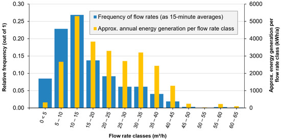 The most recent edition of the DVGW guidelines [12] provides guidance in the case of class 2 “non-buffered” sites. They suggest using a frequency distribution of the occurring flow rates to determine the design flow rate of the turbine or multiple turbines. The flow rate (or mean of a range of flow rates; e.g., 52.5 m3/h representing the range from 50 to 55 m3/h) having the greatest energy density (result of Equation (17), applied to each range of flow rates) should be the design turbine flow rate. The resulting Qturbine is then given as input into the Excel tool to calculate Eelectrical assuming the inflow regime is modified as with the tool’s optimization algorithm. In this way, this method is evaluated more generously than if it were applied as intended to class 2 sites, since the flow rates occurring above and below the chosen Qturbine would not contribute to energy generation, being too high or low to be efficiently processed by the turbine (see Section 3.2 and Table 4 for a concrete example).