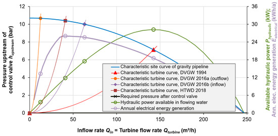 - DVGW. Energy Recovery through Hydropower Facilities in the Water Supply (In German Only); Technical Guidelines, Worksheet W 613 (A); DVGW: Bonn, Germany, 2016. [Google Scholar]