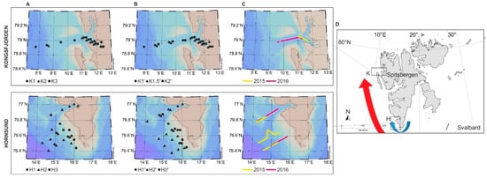 Research was conducted on the west coast of Spitsbergen in two fjords, representing different hydrographic regimes: Kongsfjorden, located in the north and Hornsund in the south (Figure 1). Hornsund is situated on the south-western tip of Spitsbergen and is influenced by the coastal Sørkapp Current, which carries less-saline, cold Arctic water [,]. Kongsfjorden is exposed to advection from the warmer Atlantic water of the West Spitsbergen Current (WSC) [,,]. The two different currents are separated by a density gradient that forms the large frontal system along the West Spitsbergen Shelf (WSS) []. Thus, Kongsfjorden receives twice as much Atlantic water than Hornsund, and this results in 1 °C higher water temperatures and 0.5 higher salinities compared to Hornsund []. However, in recent years, gradual warming has been observed in both fjords [,].
