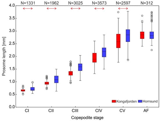 Prosome length of Calanus copepodite stages: CI–adult females (AF) in Kongsfjorden (red) and Hornsund (blue). Horizontal black lines in the boxes show the median, box represents percentiles, whiskers indicate ranges, dots represent values outside the range, red arrows show statistically significant size differences between two investigated fjords, N indicates number of measured individuals.