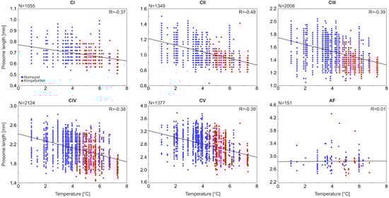 The relation between seawater temperature and prosome length of Calanus copepodite stages CI–AF. Dots represent individuals measured, blue in Hornsund and red in Kongsfjorden. Trendline is marked in black, N indicates the number of measured individuals, R indicates Pearson correlation coefficient.