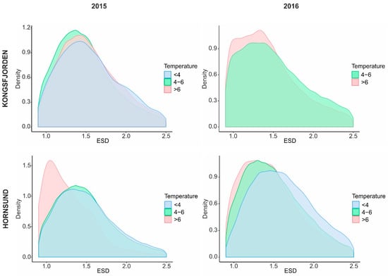 Size distribution of Calanus-type particles expressed as equivalent spherical diameter (ESD, mm) recorded by laser optical plankton counter (LOPC) in different temperature ranges in Kongsfjorden and Hornsund in 2015 and 2016.