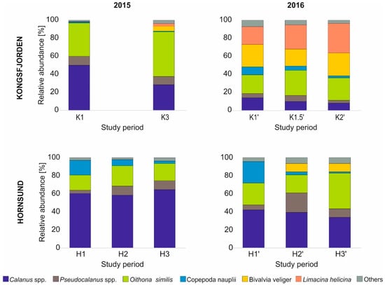 The zooplankton community structure in Hornsund also differed between the two years (PERMANOVA, MS = 3245.0, Pseudo-F = 5.83, p = 0.001) and between study periods (PERMANOVA, MS = 5222.6, Pseudo-F = 9.39, p = 0.001) of both years (PERMANOVA, MS = 1661.3, Pseudo-F = 2.98, p = 0.003). In both years, Calanus dominated the zooplankton community, constituting approx. 60% of total zooplankton abundance in all three study periods of 2015 and approximately 40% in 2016. The second most numerous taxon was O. similis with at least 20% of total zooplankton abundance throughout all the periods of both study seasons (Figure 5). Copepoda nauplii composed a significant percentage of total zooplankton abundance, especially in H1 and H1′ (20%). The contribution of Pseudocalanus spp. was in general the most important in H2 and H2′ study periods, while Bivalvia veligers comprised about 10% of all taxa in H2′ and H3′ in summer 2016.