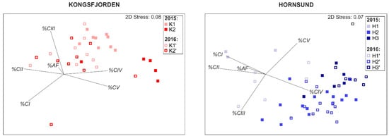 The non-metric multi-dimensional scaling (nMDS) of the Calanus copepodite structure in two Spitsbergen fjords: Kongsfjorden and Hornsund. Vectors indicate the direction of best correlating variables determined as a percentage of each copepodite stage. Their lengths correspond with the strength of the correlation.
