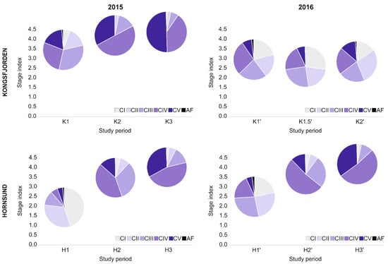 Calanus stage index (Y axis) together with copepodite stage structure (different colours) in Kongsfjorden and Hornsund in particular study periods (X axis) in 2015 and 2016.