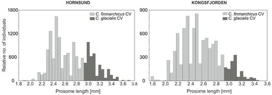 Prosome length frequency distribution of copepodite stage CV of Calanus finmarchicus and C. glacialis classified according to morphological identification after Kwasniewski et al. [] in Hornsund (n = 1798) and Kongsfjorden (n = 799).