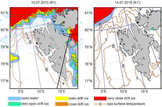 Sea surface temperature isoline and sea ice conditions (colour surfaces) in Svalbard waters in 2015 during K1 (a) and in 2016 during K1′ (b) study periods. Star icon represents Kongsfjorden study area. Data source: Norwegian Meteorological Institute.