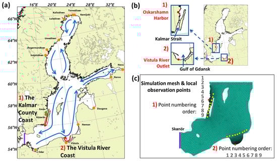 (a) The Baltic Sea locations of the (1) Kalmar County and (2) Vistula River coastal cases are shown with the associated main coastal (red arrows) and marine (blue arrows) water flows; orange dots show the locations of the 13 largest river outlets along the whole Baltic coast and green dots show the outlet locations of two relatively small local rivers at the Kalmar coast. (b) Focused illustration of the two simulated coastlines and respective solute source release locations (red dots). (c) Simulation mesh and local observation points for solute transport results along each coastline (yellow dots, numbered in shown order).