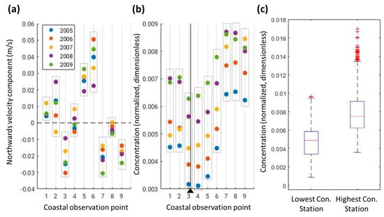 For an overall comparison of coastal solute transport and concentration patterns in the basic equivalent release scenario, Figure 2 and Figure 3 show the resulting temporal average northwards component of flow velocity (Figure 2a and Figure 3a), and concentration (Figure 2b and Figure 3b) at the different coastal observation points (Figure 1c), and a statistical summary of concentration values at the points with the lowest and the highest values (Figure 2c and Figure 3c, showing box-and-whisker plots of the concentration statistics at these points) for each coastal case (Kalmar in Figure 2, Vistula in Figure 3). The mainly negative values of the northwards velocity component in the Kalmar case shows the predominantly southwards coastal flow through the Kalmar Strait in that case, while the coastal flow directions vary (positive and negative values) in the Vistula case.