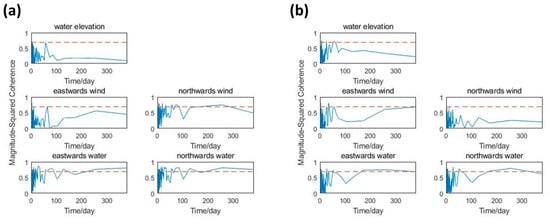 In the Kalmar case, (negative) northwards wind velocity, (negative) northwards and eastwards water velocity, and coastal solute concentration have similar periodicities (Figure 4a), indicating a chain of influence from wind driving coastal water flow that in turn drives solute distribution in this case. Figure 6a also shows this relationship with relatively high and significant coherence. Results for average variable values across all nine coastal observation points for northwards water velocity, eastwards water velocity and solute concentration are given in the Supplementary Material (Figures S1 and S2) and show similar patterns. In the Vistula case, the solute concentration periodicities are similar to those of eastwards and northwards flow and to some, lesser, degree with those of eastwards wind (Figure 5a). The magnitude-squared coherence also shows solute concentration as significantly correlated with eastwards and northwards water flow, and at some periodicities also with the eastwards wind (Figure 6b). These results reflect the hydrodynamic and transport conditions at the Vistula River case, where the flow is dominated by stable marine currents and the transport process is less influenced by the local wind conditions. Results for several other coastal observation points than the main comparative point 7 are shown in the Supplementary Material (Figures S3–S6) with further explanations (Supplementary Material text Section S1.2).