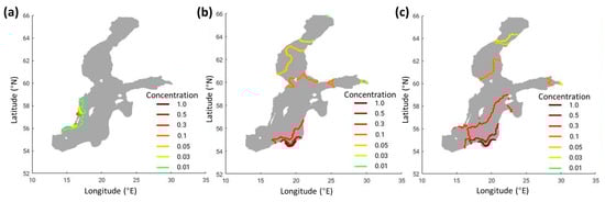 Isolines of maximum solute concentration over the simulation period for the total nutrient release scenario. (a) Kalmar County coast case with standard solute release; (b) Vistula River coast case with total nitrogen (TN)-proportional 35.6 times higher solute release; (c) Vistula River coast case with total phosphorus (TP)-proportional 55.1 times higher solute release.