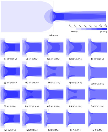 Results where the difference between very high and very low velocities was least indicated greater discharge potential as the constriction was minimal. Small changes to inlet shapes showed no real improvement (Figure 2b,g,l,q) and performed similarly to the standard square inlet corners. The 60° setups (Figure 2b–f) had the highest peak velocities in the centre jet of the four different variations. The rounded corners (Figure 2s–u) performed best, having lower peak velocities, followed by the larger 45° setups (Figure 2j,k). It should be noted that the rounded inlets improved the flows noticeably in Figure 2s with similar results in the larger configurations (Figure 2t,u).