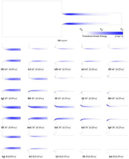 Comparison for TKE (b–p) for chamfered inlets with different angles and (q–u) for rounded inlets (all sizes in ).