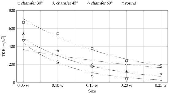The sum of TKE from every simulation is plotted in Figure 4. While the round inlets caused the least turbulence, the 30° chamfered inlets showed the highest turbulence. The 45° chamfers followed a clear downward trend, as did the round and 30° ones, but the 60° inlet modifications showed little difference in total TKE. The unmodified square corner had a much higher level of total TKE with 2173 /.