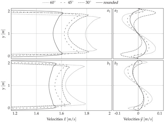 Velocities in the -direction (Figure 6) supported the results shown in Figure 5. All smaller inlet configurations with sizes from 0.05 w to 0.1 w showed opposing peaks in velocity perpendicular to the main flow direction. Results from the 0.15 w to 0.25 w setups were similar in the round and 45° scenarios, but there were greater deviations in the 30° and 60° versions, indicating poorer performance. Figure 6c showed small velocity peaks close to the culvert wall in the 0.10 w to 0.25 w setups. This indicated that eddies and recirculation were present, as the vectors pointed in the direction of the culvert walls. The velocity curves for the 0.15 w to 0.25 w round inlet configurations in Figure 6d, on the other hand, showed the most favourable behaviour. Velocities perpendicular to the main flow direction remained low throughout the culvert width and did not change their direction.