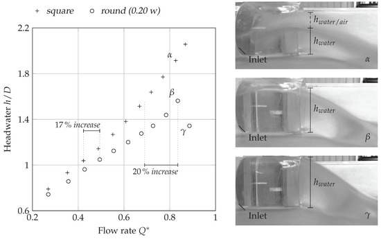 Experiments in the flume were carried out to validate the results of the CFD modelling. A small-scale culvert model was tested with two different inlet configurations, the square edge with a straight headwall, and the w round one. Figure 8 illustrates the different headwater levels between square and round inlets. The results are displayed as dimensionless values with a Froude similarity conversion according to [41]. The relative energy head is written as and the non-dimensional flow rate is defined as .