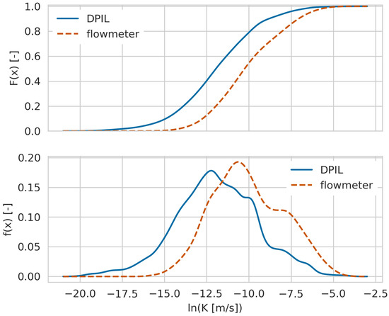 The univariate distributions of the flowmeter and DPIL logarithmic K values have similar shapes despite a shift in location. This finding is in accordance with [21]. For an improved visualisation, the cumulative density functions (CDF, Figure 2, top panel) and the probability density functions (PDF, Figure 2, bottom panel) of are plotted. The DPIL dataset has a larger portion of lower K values, a smaller portion of larger K values, and a larger spread.