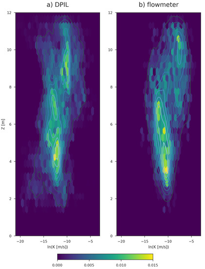 This pattern can be also seen by plotting two-dimensional histograms of versus elevation (Figure 3). Both distributions show a fairly distinct shift at about 8 m above the reference elevation (see Bohling et al. [21] for a definition of the coordinate system), with generally larger K values above this elevation and generally smaller K values below. Below 8 m elevation, the flowmeter data seem to indicate a slightly increasing trend with increasing depth, a trend which might also be reflected in the DPIL data if one considers the higher density region of the data, discounting the relatively small proportion of very low DPIL K values at elevation m.