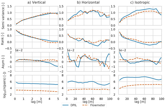 The vertical normalised semivariograms, and Rank and Asym measures for the two datasets are very similar (Figure 4, left column) and the equivalent isotropic versions of the semivariograms and rank correlations are also fairly similar (Figure 4, right column). Although DPIL has smoother results than flowmeter, which is influenced by the finer vertical sample spacing of the DPIL dataset. A somewhat larger difference can be found in the horizontal direction (Figure 4, central panel). This may be caused by the difference between the lateral distributions of the flowmeter and DPIL profiles. This difference can be expressed as the difference in the number of the data pairs (bottom row on Figure 4). The rank correlations between horizontal lags of 2.5 m and 17.5 m are closer to each other than are the normalised semivariograms, most likely because of the smaller impact of outliers in the rank space.