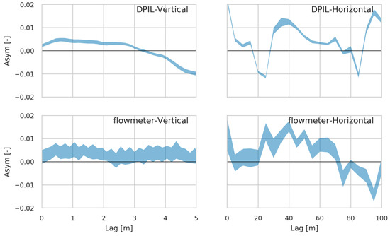 In the vertical direction, the Asym values for the two datasets are essentially identical up to a lag of 3 m. For larger separation distances the Asym value of the DPIL data decreases, reaches zero at 4 m, and becomes negative beyond 4 m. In contrast, Asym remains positive for the flowmeter data. The observed behaviour of Asym indicates stronger dependence among lower K values for the DPIL dataset and among larger K values for the flowmeter dataset at large lag distances. This difference might be caused by underestimation of high K values by the DPIL and overestimation of low K values by the flowmeter [20]. Another possible reason is the difference of the distribution of the observations in the vertical direction; although the DPIL data have been trimmed to match the vertical extent of the flowmeter data sitewide [20], the vertical extents of DPIL and flowmeter profiles still differ somewhat on a local basis. This may lead to a difference of the density of higher and lower K values (Figure 3) in the two datasets, contributing to the differences in the Asym values.