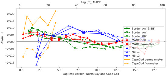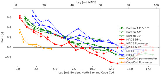 This bootstrap analysis (Figure 5) shows that is significantly different from zero at most lags for either dataset, indicating that the MADE site K field exhibits a non-symmetric, and thus non-Gaussian, spatial dependence structure. We have performed similar analyses for other well known K datasets, including those from Borden, Canada [14], Cape Cod, USA [36], and North Bay, Canada [30]. All these data-sets exhibit similar second-order dependence with different ranges (Figure 6), but the non-linear measure Asym deviates meaningfully from zero (Figure 7). In addition, many of the Asym values change sign at certain lags, indicating that for some separation distances larger K quantiles exhibit stronger spatial dependence than smaller quantiles, with the opposite behavior prevailing for other separation distances. These sign changes indicate variations in the clustering behaviour of K that are likely to influence groundwater flow and solute transport and that can not be described using two-point geostatistics.
