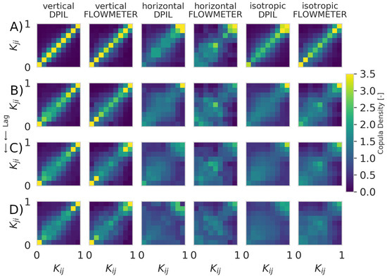 Empirical copula densities in the vertical direction (DPIL: 1st panel, flowmeter: 2nd panel), in the horizontal direction (DPIL: 3rd panel, flowmeter: 4th panel) and the isotropic case (DPIL: 5th panel, flowmeter: 6th panel). Distances from top to bottom are (A) 0.15, (B) 0.375, (C) 0.525, (D) 0.675 meter in the vertical direction and (A) 2.5, (B) 7.5, (C) 12.5, (D) 17.5 meter in the horizontal direction and the isotropic case.