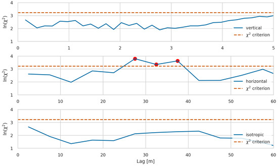 with a significance level 0.05 in the vertical direction (top), the horizontal direction (middle), and the isotropic case (bottom). Distances with values larger than the criterion (dash line) indicate dissimilar copula densities between two datasets (red points).