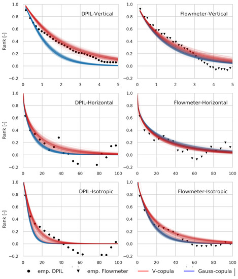 The estimated copula model parameters are shown in Table 2 and Table 3 and the model-based rank correlations computed are compared with the empirical rank correlations in Figure 10. For the v-copula estimates, the parameter is much smaller than 3.0 in all cases, indicating a non-Gaussian type of dependence. To evaluate the performance of Gauss-copula and v-copula models, Akaike information criterion ( [38], where L is the likelihood, and is the number of free parameters in the model.) is used. The estimations with a v-copula model have smaller AIC values than the estimations with a Gauss-copula model in all cases, indicating that the v-copula models provide a better fit. Compared with the rank correlations from the Gauss-copula model, the rank correlations from the v-copula model are closer to the empirical rank correlations (Figure 10). These results demonstrate the existence of non-Gaussian spatial dependence at the MADE site in high dimensions (where dimensionality here refers to the size of the data subsets). Compared with the bivariate measures in Section 3.2, these model fits show that the two datasets exhibit notable differences in higher dimensions (Table 2 and Table 3), with the following observations: (a) the flowmeter dataset exhibits a more Gaussian type of dependence than the DPIL dataset, which is indicated by the larger value of for the flowmeter data and is also apparent in Figure 10; (b) the flowmeter dataset has a smaller range in the vertical direction and larger ranges in the horizontal directionthan the equivalent isotropic case; (c) the Gauss-copula model estimates resulted in smaller ranges than the v-copula fits. The ratios of the horizontal range and the vertical range of v-copula fits (8.36 for DPIL and 14.27 for flowmeter) are closer to the empirical anisotropy ratio (Table 1) than the ratios of Gauss-copula fits (10.47 for DPIL and 18.65 for flowmeter); (d) The value of for the flowmeter data in the isotropic case is significantly different from the values estimated in the vertical and horizontal cases; (e) The diversity of the results show the uncertainty of two datasets in different directions.