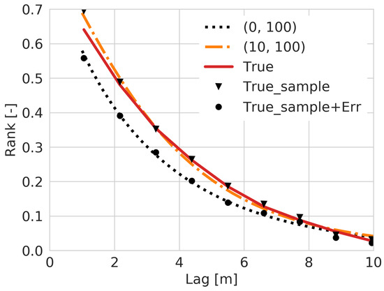 Comparison between the Gaussian copula parameter estimation with left side detection limit (orange dash-dotted lines with label “(10,100)”), without the detection limit (black dot line with label “(0,100)”) and the rank correlations of true domain with 10,000 points (red solid line with label “True”), a sample of the true domain with 2500 points (black inverted triangles with label “True_sample”) and the sample with a Gaussian noise (black dots with label “True_sample+Err”) by using a simulated log-normal Gaussian field.