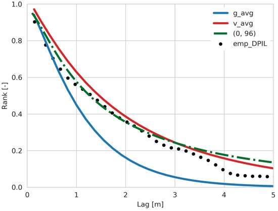 The copula-based rank correlation (Equation (2)) and asymmetry (Equation (3)) are two univariate functions of lag that can be used to quantitatively summarise the empirical copula density. The copula-based rank correlation (Rank in (Equation 2)) describes spatial dependence in a fashion similar to the covariogram (). However, since it is based on , it is less influenced by extreme values. It can be calculated as [14]