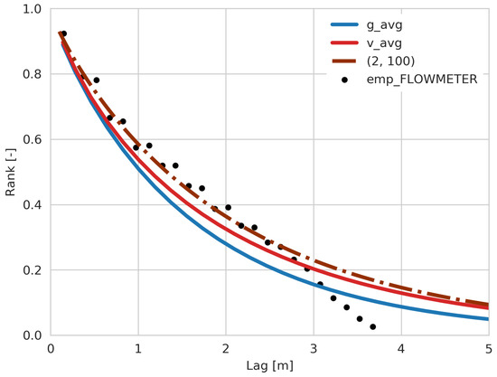 Comparison between the Gaussian copula parameter estimation with left side detection limits (dash-dotted gray line with label (2, 100)), without detection limit (solid blue line with label g_avg), v-copula parameter estimation without censored threshold (sold red line with label v_avg) and empirical rank correlation of the flowmeter dataset in vertical direction (black dots with label emp_FLOWMETER).