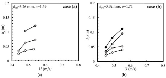 The stability of armor layer around the pier is influenced by parent particle size, median diameter of armor particles and approach flow properties. The maximum scour depth (hs) variations at equilibrium condition with time-averaged flow velocity (U) for different diameters of piers along with different sizes of gravels is shown in Figure 3a–h. It can be noted that coarser gravels show less variation of maximum scour depth with approach flow velocity, while medium gravels show higher variation. It can also be noted from Figure 3, the maximum scour depth in armored streambeds increases with approach flow velocity and that for any sizes of streambed particles, different sizes of particles of armored streambeds illustrate a different maximum scour depth. It has been found that the maximum scour depth variation is higher for fine gravel beds (d50 = 3.26 − 4.94 mm) and lower for coarser gravel bed (d50 = 7.5 − 10.7 mm). For particular streambed sediment, the maximum scour depth increases with increase in pier diameter and approach velocity.