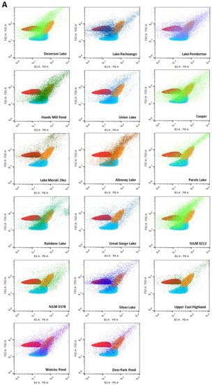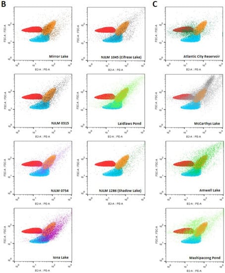 Flow cytometric analyses showed that 17 water bodies, including Deverson Lake, Lake Pachoango, Lake Pemberton, Cooper Lake, Hands Mill, Lake Morski Oko, Alloway Lake, Parvin Lake, Rainbow Lake, Union Lake, Great Gorge Lake, NJLM 0213, NJLM 0378, Silver Lake, Upper East Highland, Watchu Pond, and Deer Park Pond, contained cyanobacteria including Microcystis spp. (orange), Synechococcus spp. IU 625 (blue), Cylindrospermum spp. (red), and their related species based on the FSC vs. PE profiles (Figure 3A).