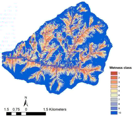Town Brook watershed: wetness classes based on the topographic wetness index.