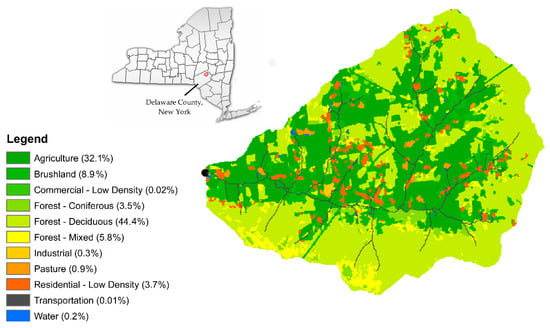 In SWAT-with-impervious-layer (SWAT-wil), the hydrological response is based mainly on the landscape position, and therefore a landscape position factor needs to be added to each HRU. To do this, we ranked the HRU from the greatest topo-index (wettest) to the lowest (driest) into wetness classes (Figure 1). Note that we assumed that the land use was included indirectly because the landscape position determines crops grown and not the opposite []. For example, in soils with a restrictive layer at shallow depths in the humid Catskill Mountains, forests are found on the steep and fast draining hillslopes, agricultural crops on the mid and lower slopes with sufficient water, and grassland or marsh plants in the wet valley bottoms []. Additional details of the approach can be found in Reference [].