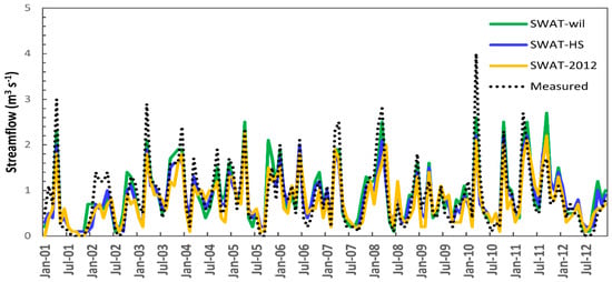 Comparison of monthly time series of streamflow simulated by SWAT-2012, SWAT-wil, and SWAT-HS with measured streamflow in Town Brook for the calibration and validation period 2001–2012.