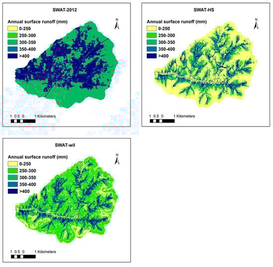 The spatial distribution of surface runoff amounts simulated by SWAT-wil were similar to SWAT-HS (Figure 4). As runoff occurs from the saturated areas, this indicates that the distribution of the saturated areas was similar. Saturated areas were predicted accurately by SWAT-HS []. Therefore, the temporal and spatial distribution of surface runoff predicted by SWAT-wil was realistic as well. Overland flow in SWAT-2012 simulated as infiltration excess was much more than either SWAT-HS or SWAT-wil and would imply a much larger area that produces surface runoff (Table 4).