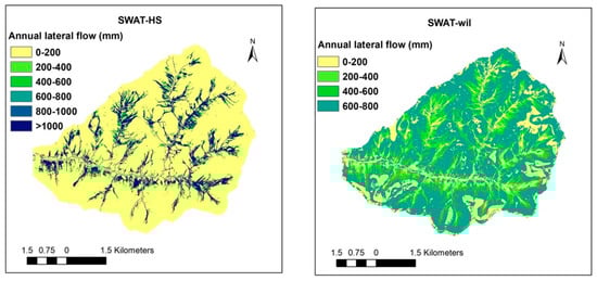 Simulated lateral flow by SWAT-wil and SWAT-HS for the Town Brook watershed. The lateral flows by SWAT-2012 are small and not shown.