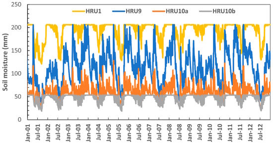 Soil water content of HRUs 1, 9, 10a, and 10b.