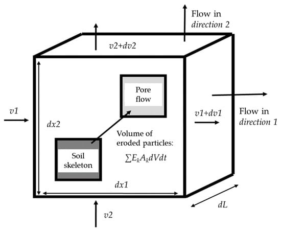 Taking the GSD into consideration, as shown in Figure 1, we assume that the particles from the soil skeleton would be eroded into the pore flow and increase its concentration, considering the two-dimensional seepage flow in the directions 1 and 2. During the time period of dt, the volume of eroded soil particles is ∑EkAkdVdt, where Ek denotes the erosion rate of kth size group section defined as the volume of eroded particles per erodible area per time, Ak denotes the erodible area per unit volume of kth size group, dV = dx1dx2dL, and dx1, dx2, and dL are the dimensions of the unit volume, respectively.