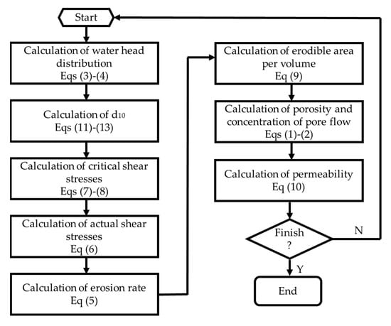 The equivalent shear stress τ in the model is a macroscopic measure of the microscopic seepage shear stress exerted on the soil particles in the unit volume, and the potential difference between these two items is compensated through the calibration of erodible coefficient α in Equation (5). Meanwhile, the erosion of the fine particles is assumed to be equivalent to the process of sediment transportation, such an idea is also introduced when calculating the critical shear stress τc.