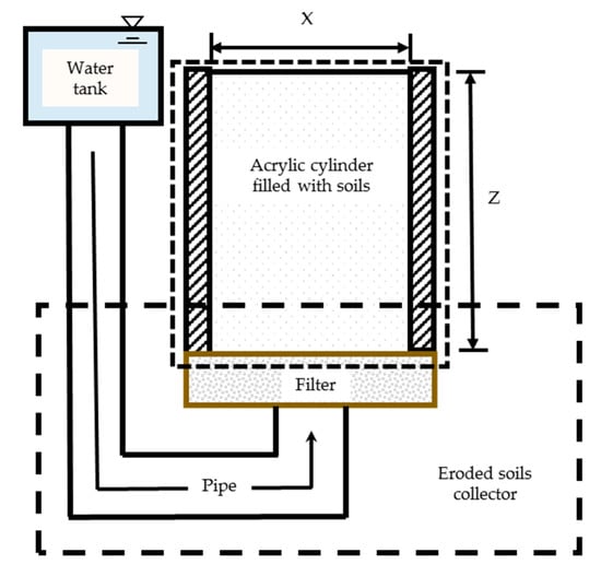 The designs in experimental devices between these studies were similar: their experiments were conducted using acrylic cylinders filled up with fully mixed soils (see Figure 5). The upper end of the cylinder was the outlet of the seepage field, which allowed free outflow (also known as being downstream of the seepage field), and the discharge of the seepage flow was measured when running the experiment. The lower end was the inlet of the seepage field (also known as being upstream of seepage field), which connected the filter layer and the water pipe. The filter layer was designed to make the inflow distribution more stable, and the water pipe was used to connect the soil device with the water tank.