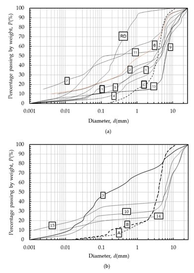 The GSD curve of soils in Lau [], Lafleur et al. [], and Chapuis et al. [] are shown in Figure A2: