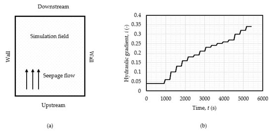 The simulation domain is proposed considering the circular symmetry of the seepage field, and assuming a two-dimensional flow at the vertical cross-section plane. As shown in Figure 7a, the domain covers a rectangle cross-sectional area. The size of the area is corresponding to the actual size of experimental device. Therefore, for the runs in Skempton and Brogan [] the height of the domain is set as 155 mm and the width is set as 139 mm; and for the runs in Wan and Fell [] the height is set as 300 mm and the width is set as 300 mm. The inlet boundary is imposed with a stable, consistent water head at each stage of hydraulic gradient. Taking Run B in Skempton and Brogan [] as an example, the loading history is shown in Figure 7b.