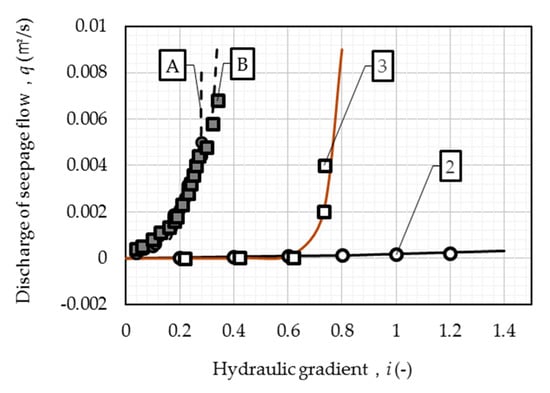 The internally unstable runs (e.g., Runs A and B) and internally stable runs (e.g., Run C) in Skempton and Brogan [] show obvious difference in shape of q-i curves. For example, when i = 0.28 and 0.34, curves of Runs A and B show a sudden rise, respectively, whereas the curve of Run C shows a stable trend all over the experiment. The explanation is as follows: for Runs A and B, as particles are massively eroded by the seepage flow under a specific hydraulic gradient i, the porosity n and the hydraulic conductivity ks increases, as well as the discharge q; while for Run C, less soil particles are eroded under such a hydraulic gradient which triggers massive suffusion in Runs A and B, or an even higher hydraulic gradient. The simulation result of the data by Wan and Fell [] show a similar phenomenon.