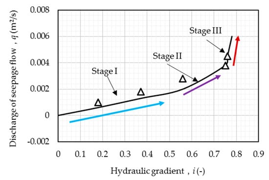 In stage I (i < 0.55), discharge of seepage flow q grows linearly with the hydraulic gradient i, during this stage the out flow is “clear” according to the corresponding experimental record; and in stage II (0.55 < i < 0.76), q grows in a nonlinear, but controlled, trend with i, during this stage the outflow is “cloudy” according to the corresponding experimental record; and in stage III (i > 0.76 = ic), one may notice an abrupt change of q-i curve, and this abrupt change may indicate the failure of soil fabrics.