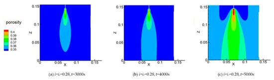 Figure 13a–c denotes porosity distribution when i = ic = 0.28 (corresponding to stage III), during the loading time t = 3000 s, 4000 s and 5000 s. The high-porosity zone grows so rapidly and intensely that it connects the upstream to the downstream. Such a phenomenon indicates an unsteady status under the massive suffusion behavior.